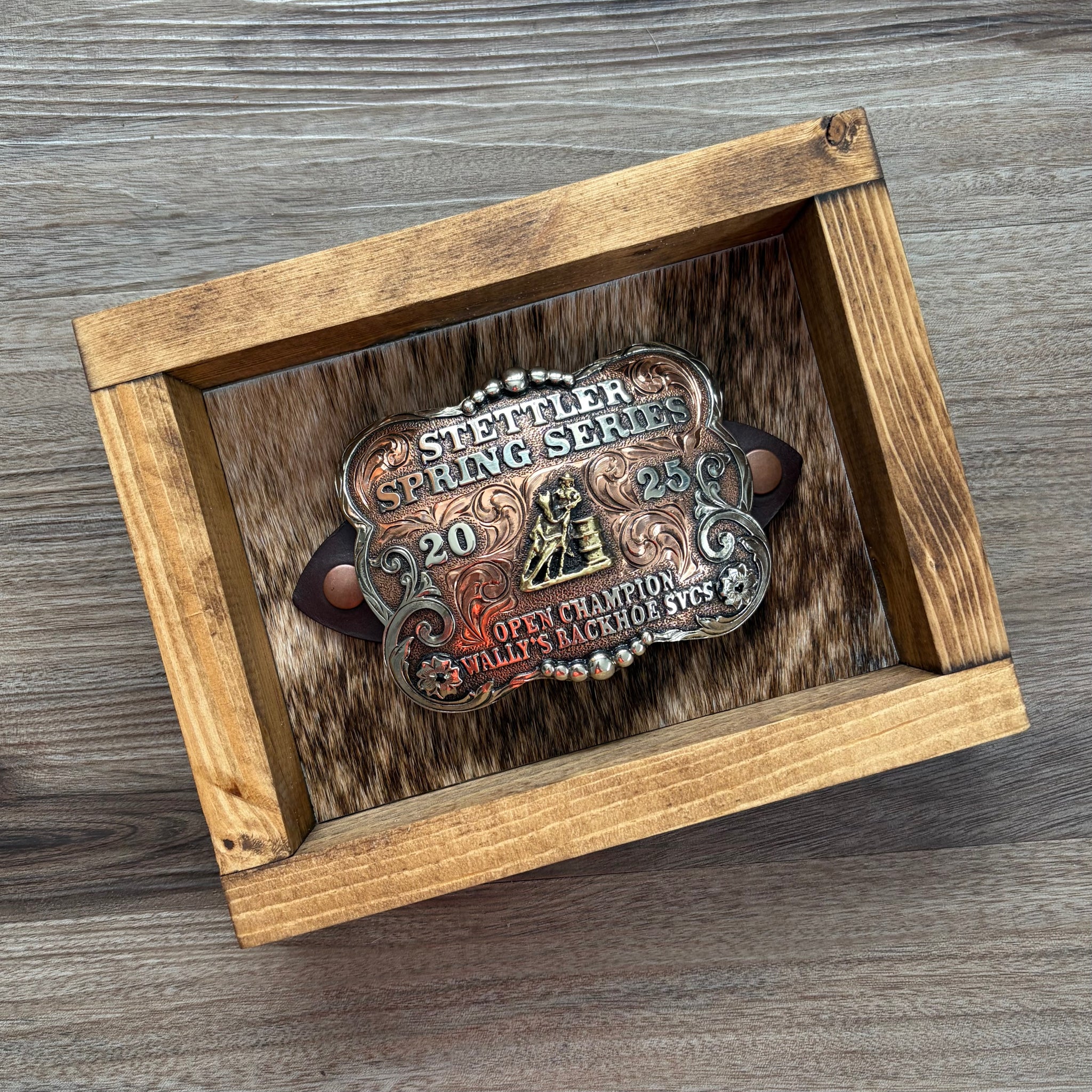 All made by hand! Brazilian Cowhide and Grade A strap leather! Fits one buckle. Strap is 1.5” wide. Total dimensions are 8.25” by 6.5”. Can be hung on a wall or sit on a shelf.  Buckle not included